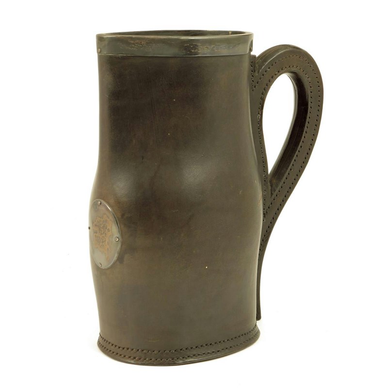 An Edwardian leather and silver mounted jack, the front with a vacant oval plaque, the base stamped 'ROSS WINCHESTER', the silver hallmarked F.J. Ross, Sheffield 1909, 24.7cm high, 9cm wide.
