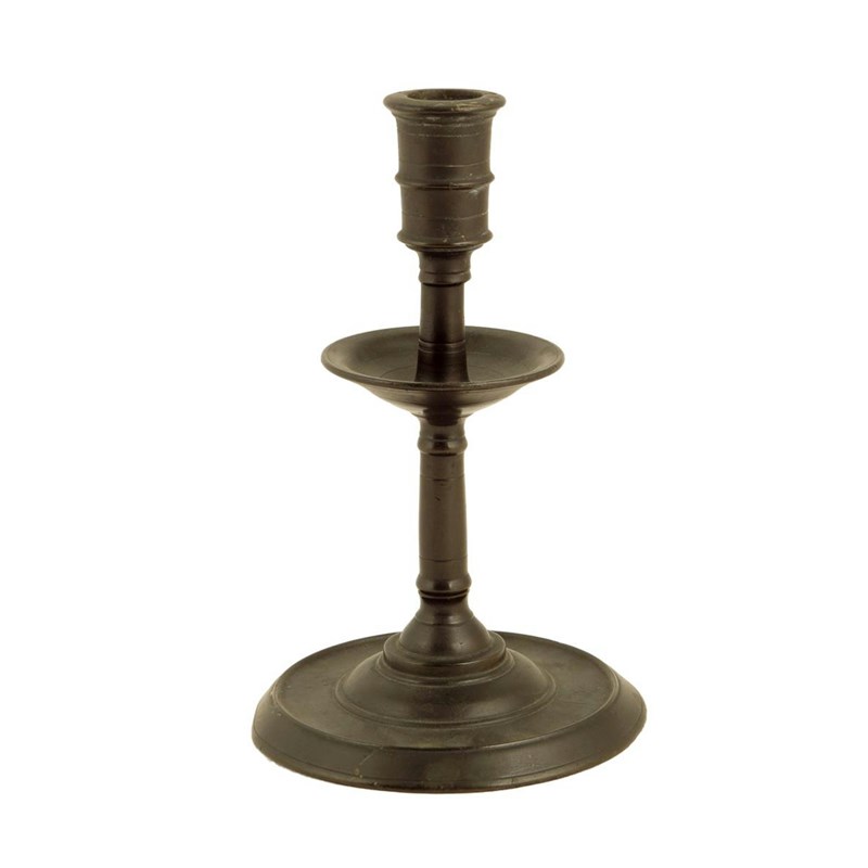 A continental bronze candlestick, with a turned stem and a central drip-pan, possibly Flemish or German 16th / 17th century, 19.5cm high, 12.5cm diameter.