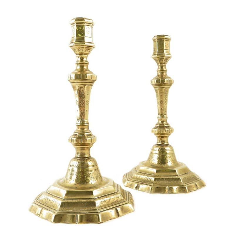 A pair of Louis XIV brass candlesticks, each with punched decoration, the faceted stem to a stepped base, 23.6cm high, 13.5cm wide. (2)