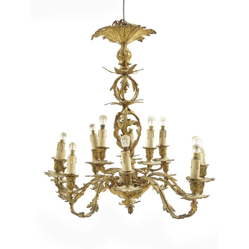 An early 19th century gilt brass fifteen light chandelier, with an open leaf stem to leaf scroll arms and with a bud pendant originally hung wtih glass lustres, 73cm high, 70cm wide.