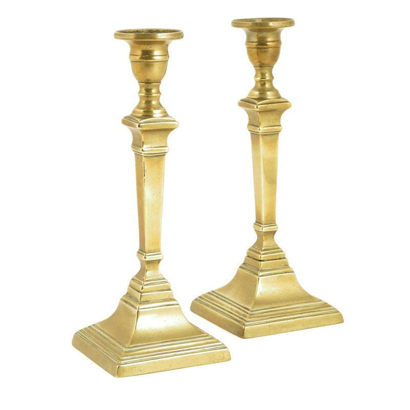 A pair of George III brass candlesticks, with urn nozzles on square tapering stems, 25.3cm high, 9.7cm wide. (2)