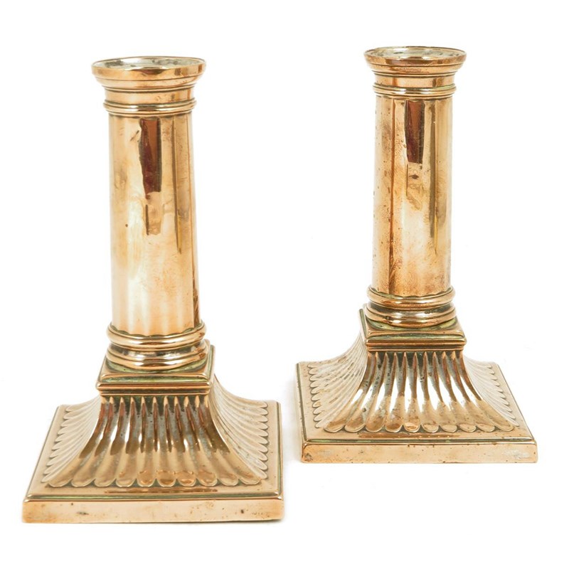 A pair of George III Old Sheffield plate candlesticks, with faceted stems and fluted square bases, the silver plating very worn, 13.4cm high, 8cm square. (2)