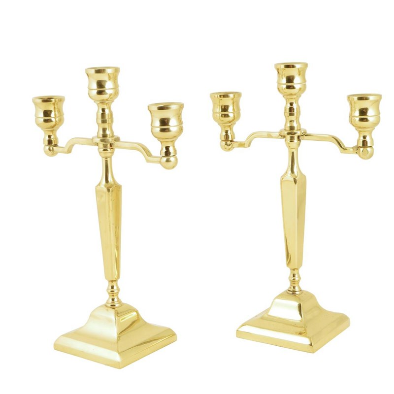 A pair of Edwardian brass candlesticks, each with three sconces, stamped 'MADE IN ENGLAND', 23.5cm high, 16cm wide. (2)