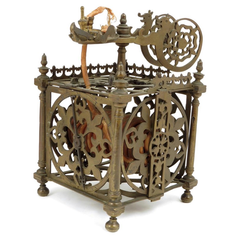 A brass wax jack, in the form of a lantern clock with a pierced dial with mythical beast and rosette handles and a detachable go-to-bed, 24cm high, 15cm wide, 22.5cm deep.