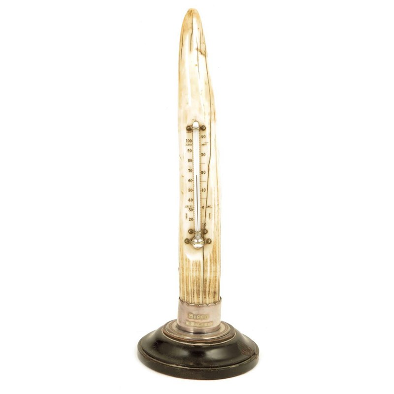 λ A late 19th century hippo tusk thermometer, with silver plated mounts inscribed 'HIPPO N.NIGERIA', on an ebonised base, 30.4cm high, 11cm diameter.