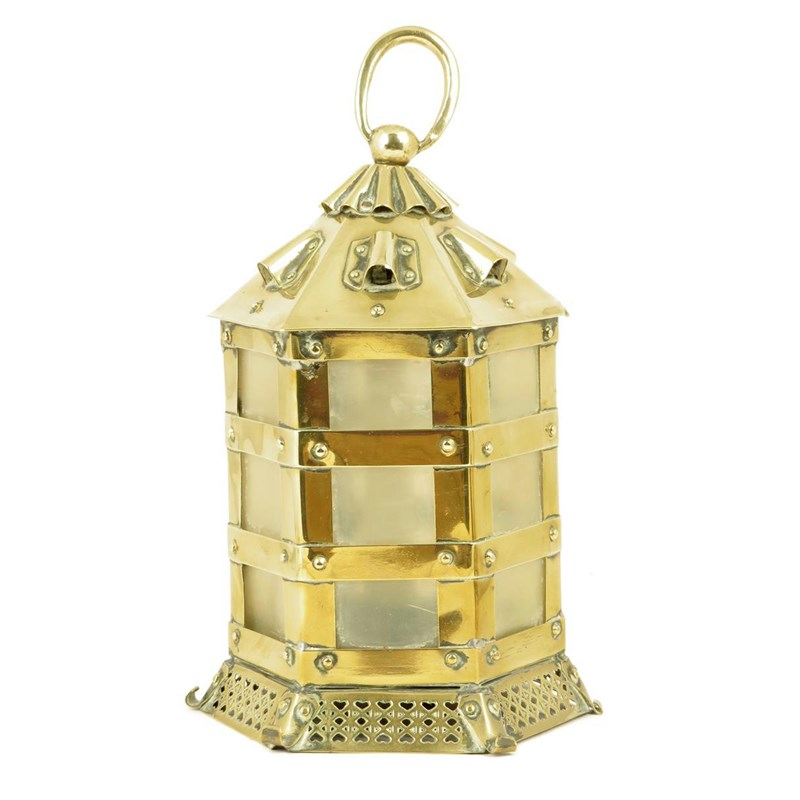 A hexagonal brass pendant lantern, with a fixed ring handle to horn panels and a pierced heart and 'X' apron, the underside with a detachable candle holder, early 19th century, 30.7cm high, 18.8cm wide.