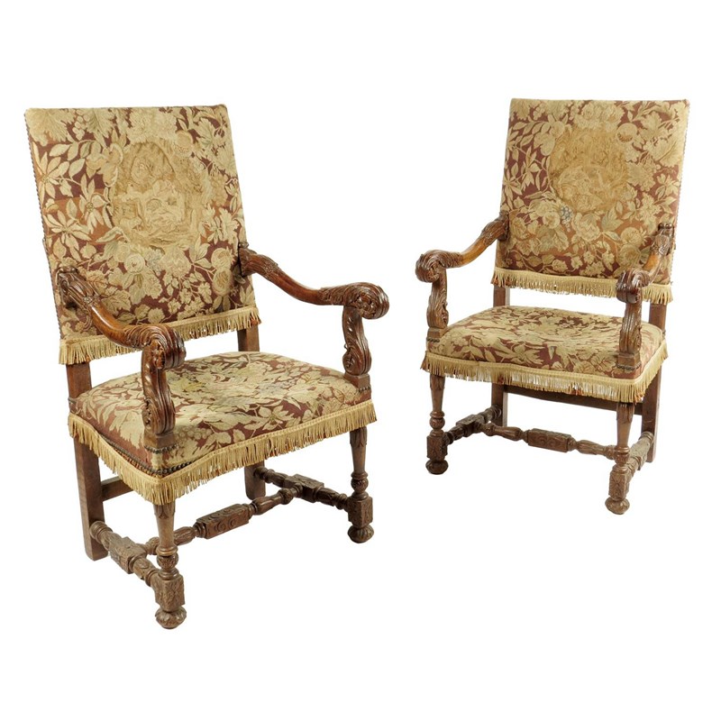 A pair of late 17th century style walnut open armchairs, each with a tapestry back and seat, the leaf and flower carved arms on tapering stretchered legs, 19th century. (2)