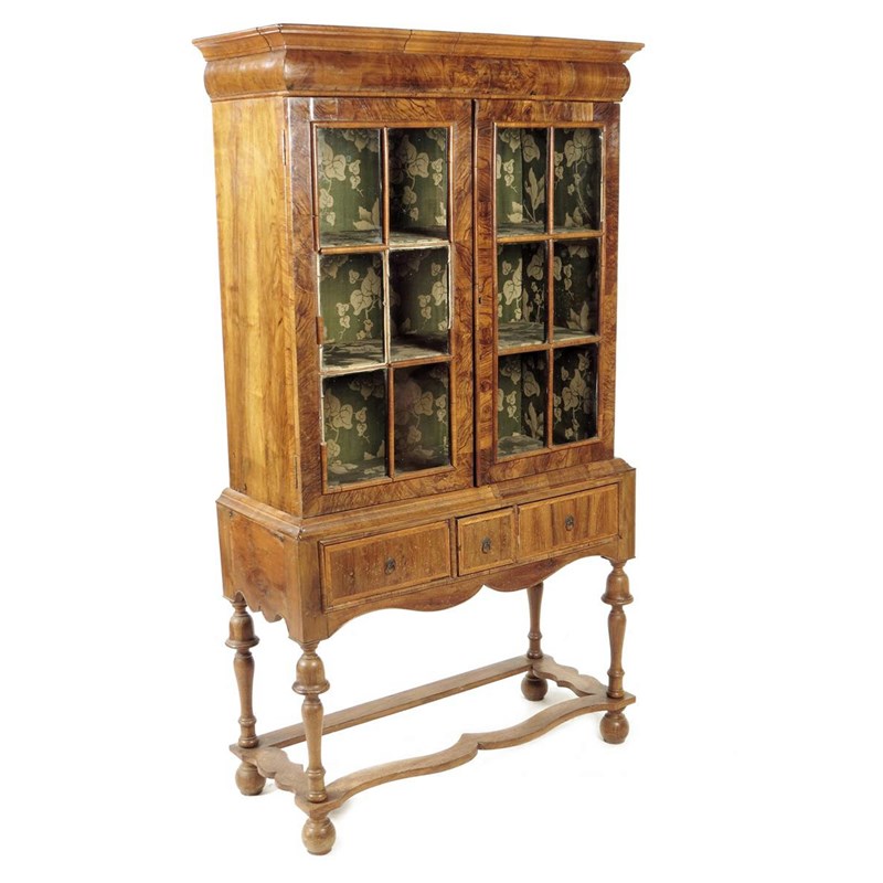 A walnut display cabinet on stand, with a pair of astragal glazed doors enclosing two fixed shelves, the stand fitted with three drawers on turn supports united by peripheral stretchers, early 18th century and later, 161.2cm high, 88cm wide, 38.5cm deep.