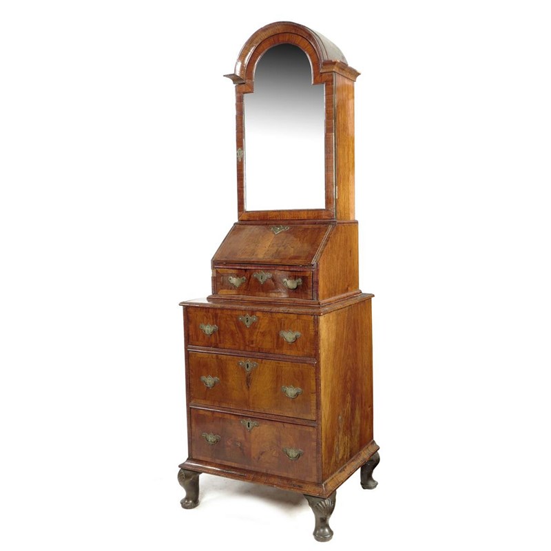 A walnut bureau cabinet on chest in early 18th century style, the arched cornice above a mirrored door enclosing shelves, a cupboard and three drawers, above a hinged fall revealing pigeon holes, two drawers and a cupboard, to a shaped front drawer, the base with three long drawers on shell capped cabriole legs and pad feet, 198.9cm high, 67.8cm wide, 56cm deep.
