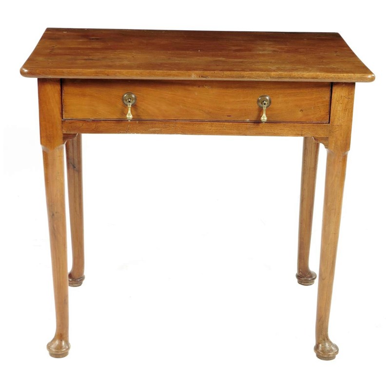 A George II walnut side table, fitted a frieze drawer with later brass drop handles on turned club legs and pad feet, 73.5cm high, 78.3cm wide. 49cm deep.