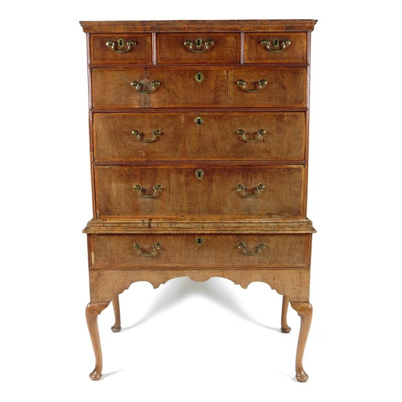 An early 18th century walnut chest on stand, with oak sides with three short and four long feather banded drawers, fitted with later brass handles on cabriole legs, 155.2cm high, 99.4cm wide, 57cm deep.
