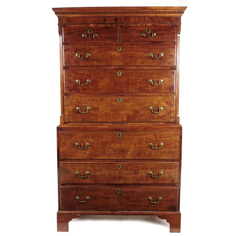 A George III mahogany secretaire chest on chest, the dentil cornice above two short and three long graduated drawers flanked by fluted canted angles, the base with a secretaire drawer fitted with pigeon holes, drawers and a central cupboard flanked by secret pilaster compartments above two further long drawers, on bracket feet, 191.8cm high, 110cm wide, 54.7cm deep.