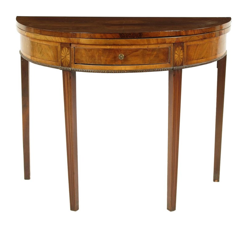 A late 18th century mahogany card table, with inlaid stringing and a frieze drawer, 73.6cm high, 91.5cm wide, 45cm deep.