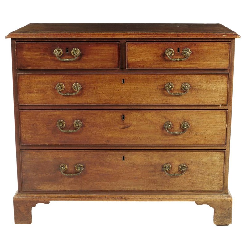 A George III mahogany chest, the crossbanded top above two short and three long graduated drawers, fitted with later brass handles, 91cm high, 103.1cm wide, 53.7cm deep.
