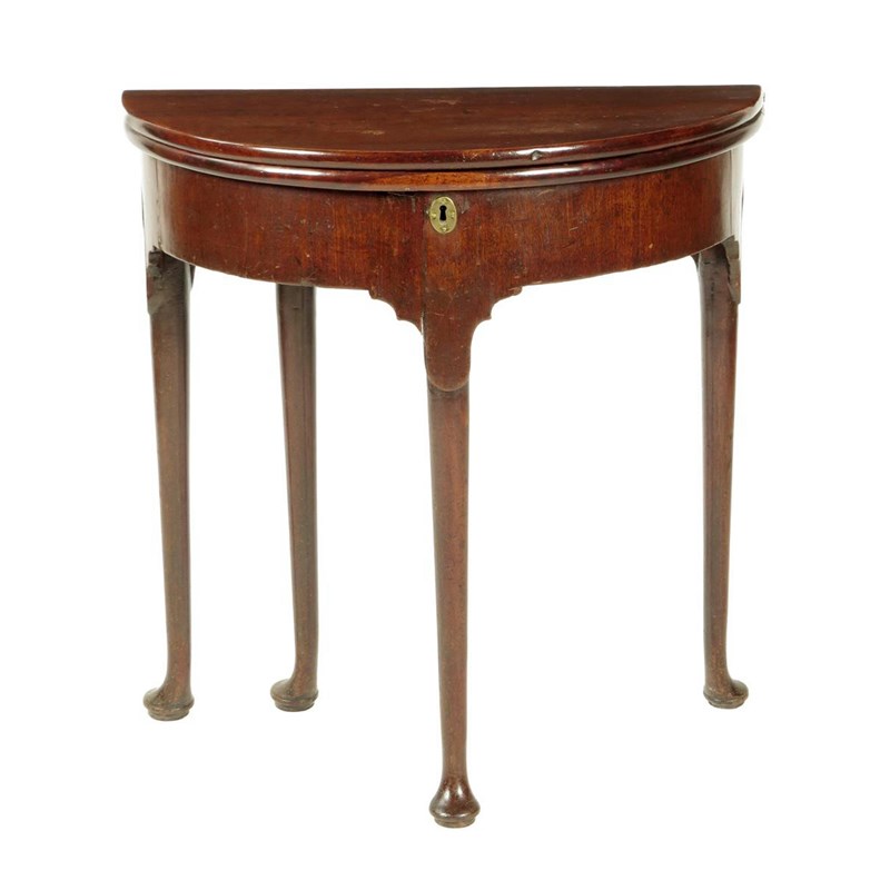 A George II mahogany demi-lune tea table, the hinged top on a single gate support above a vacant compartment on club legs and pad feet, 72cm high, 68.1cm wide, 33.7cm deep.