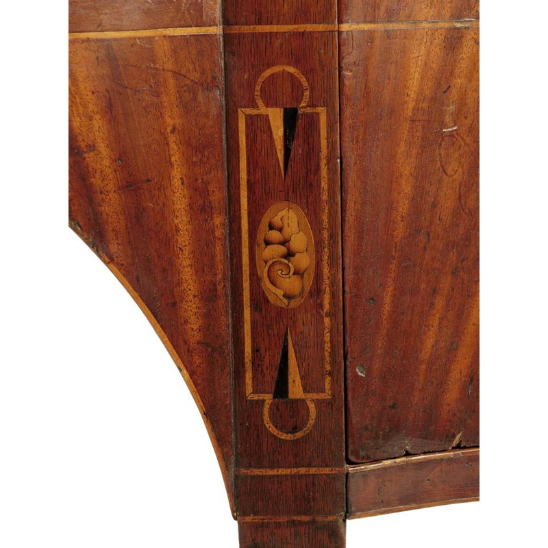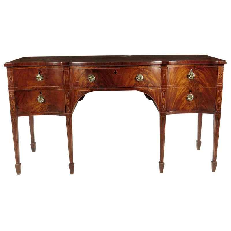 A George III mahogany serpentine sideboard, inlaid stringing, the crossbanded top with segmented veneers, centered an oval panel above a frieze drawer flanked with a deep drawer to the right with a lift-out lead lined cellaret tray, the left with a drawer and a cupboard, all fitted with replaced brass handles, the square tapering legs inlaid marquetry conch shells terminating in spade feet, 93.7cm high, 172cm wide, 73.5cm deep.