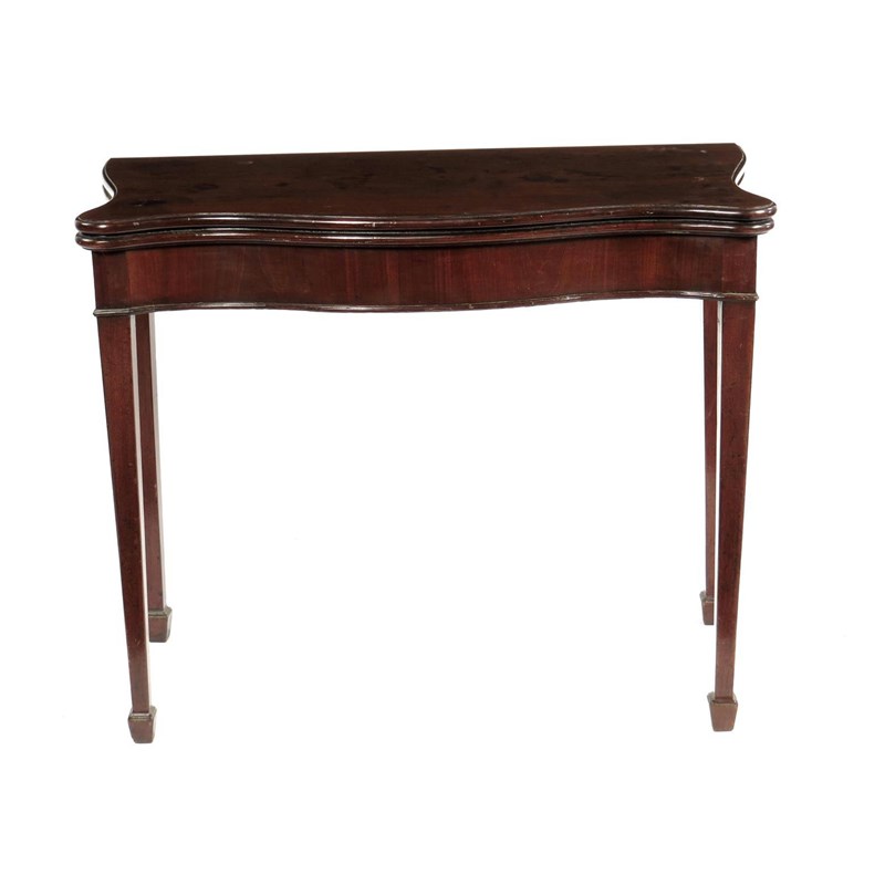 A George III mahogany serpentine card table, the fold-over top on a single gate support, 73cm high, 87.5cm wide, 45.3cm deep.