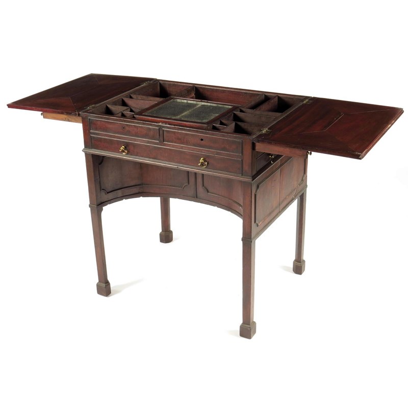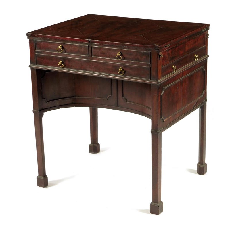 A George III mahogany dressing table in Chippendale style, the twin hinged top revealing a sliding ratcheted mirror flanked by division above a pair of cupboard doors with outline mouldings, the part concave reverse with false drawer fronts, the sides each with a drawer on chamfered legs and block feet, 76.3cm high, 67cm wide, 53cm deep.