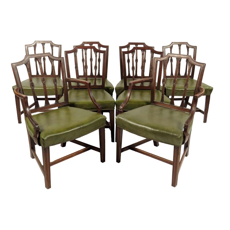 A set of eight George III mahogany dining chairs, the backs with triple vertical splats carved with leaves and a patera on brass studded stuffed-over seats and moulded front legs, with 'H' stretchers comprising: two open arm chairs and six side chairs. (8)