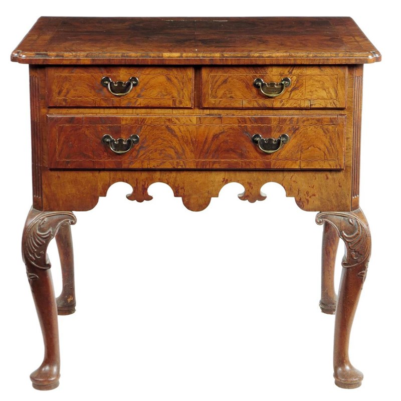 A George II walnut lowboy, inlaid stringing, the quarter veneered and crossbanded top with re-entrant front corners above two short and one long drawers, with replaced brass handles, flanked by fluted angles to a shaped apron and on leaf capped cabriole legs and pad feet, 75.5cm high, 78.6cm wide, 53.3cm deep.