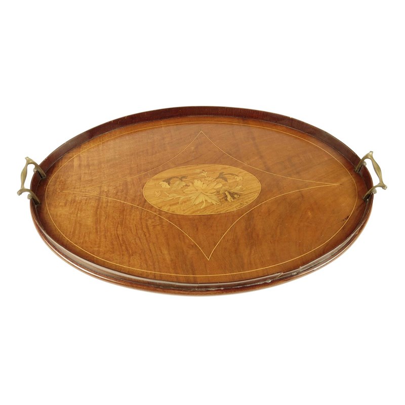 A late Victorian mahogany and marquetry oval drinks tray