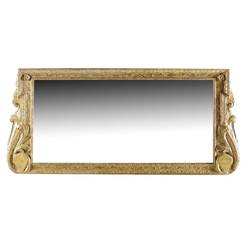 A George II giltwood and gesso overmantel mirror, the replaced bevelled plate to a moulded and leaf carved frame on a punched ground, originally with candle sconces, 48.7 x 104cm.