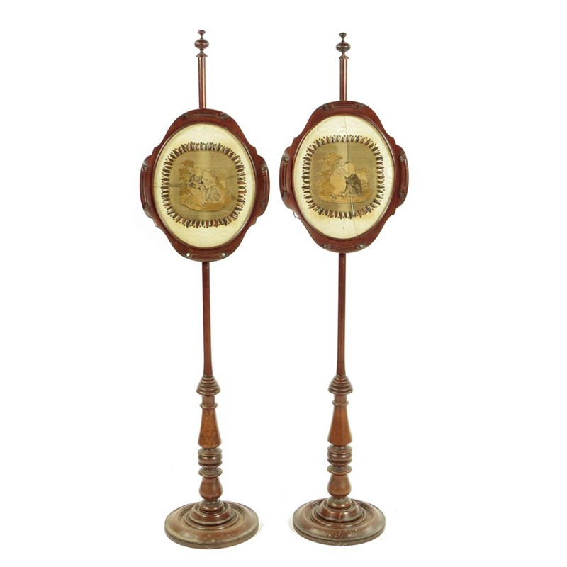 A pair of William IV mahogany pole fire-screens, the adjustable silk and embroidered panels on turned stems, 141.4cm high, 34.4cm wide (2).