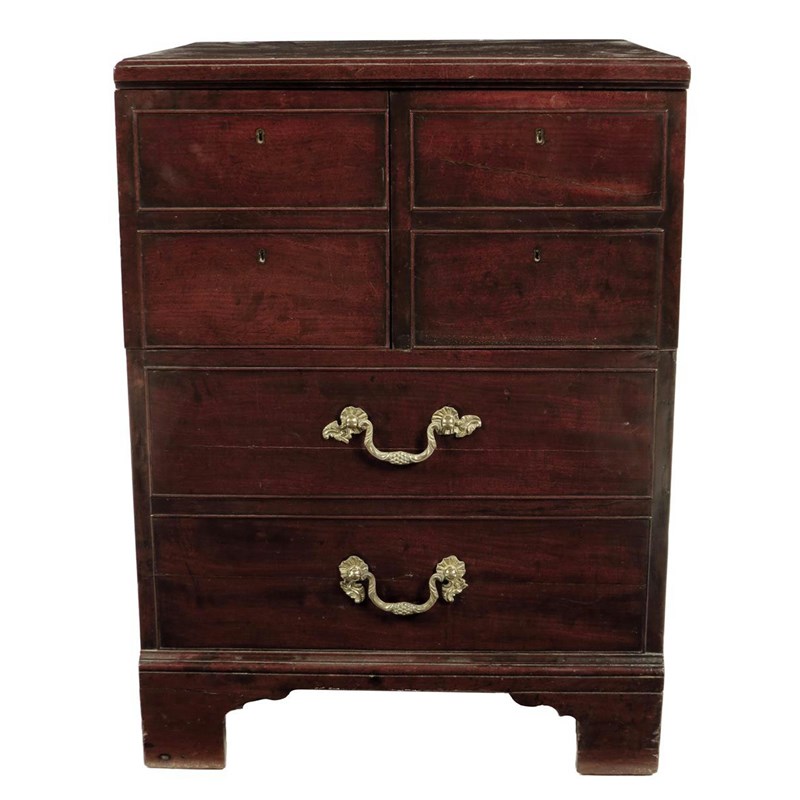 A George III mahogany commode chest, the hinged top above a pair of hinged doors with false drawer fronts on bracket feet, 75.8cm high, 55.5cm wide, 47.5cm deep.