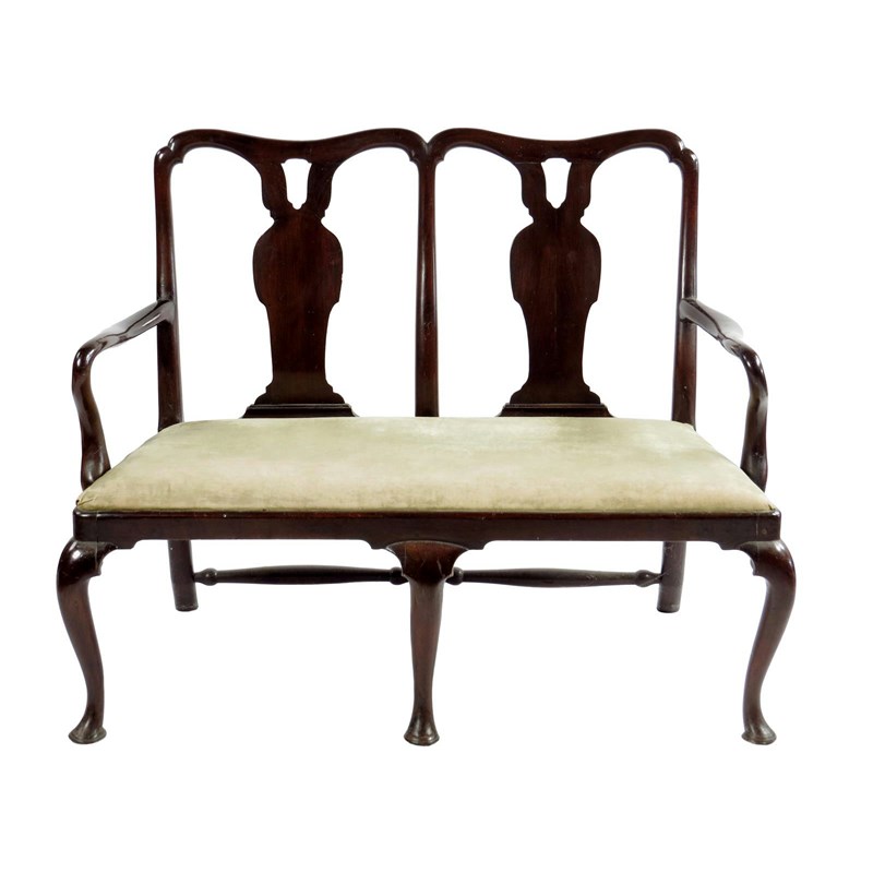 An 18th century style mahogany twin chair back settee, with pierced vase splat backs and shepherd's crook arms, to a drop-in seat on cabriole front legs, 96.8cm high, 125.7cm wide, 55.5cm deep.