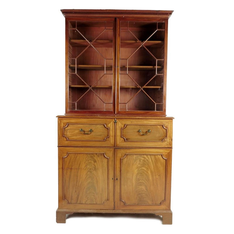 A George III mahogany secretaire bookcase, with a pair of astragal glazed doors, enclosing three adjustable shelves above a baize lined secretaire fitted with drawers, pigeon holes and a central cupboard with two further drawers with a brass Bramah lock above a pair of cupboard doors enclosing four pull-out slides, 231.2cm high, 125.5cm wide, 62.5cm deep.