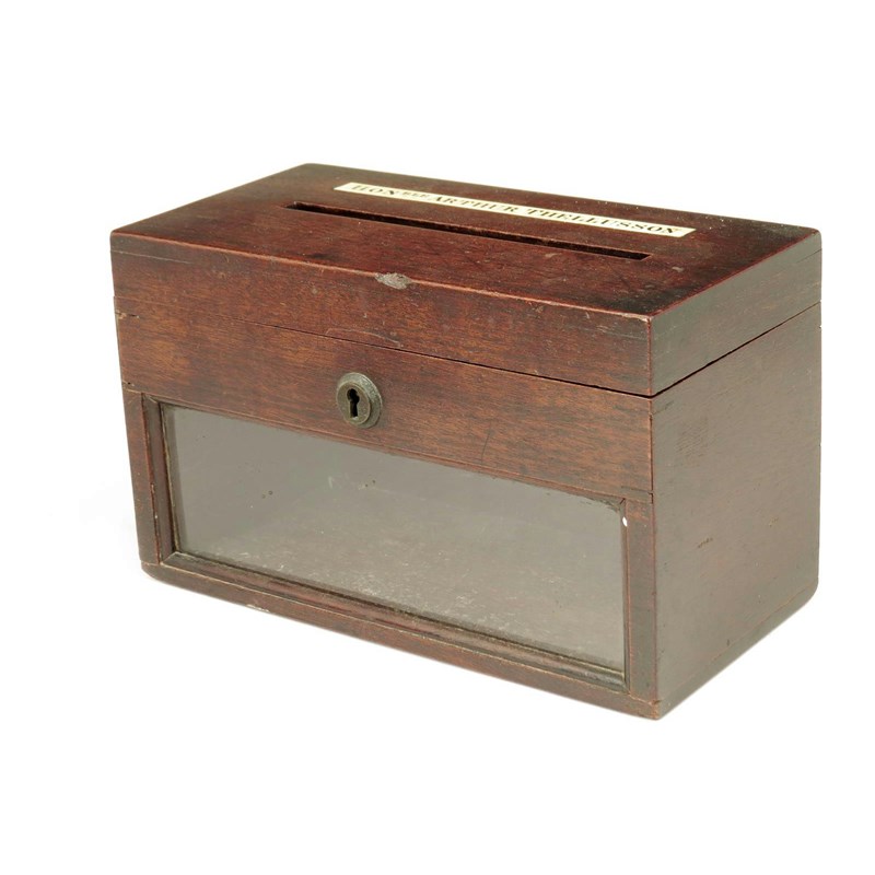 An early 19th century mahogany letter box, the hinged lid with a single slot and a bone panel inscribed 'HONBLE ARTHUR THELLUSSON', to a part glazed front, 14cm high, 23cm wide, 11.4cm deep.