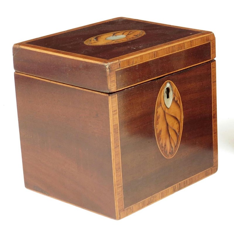 λ A George III mahogany tea caddy, with rosewood banding and inlaid marquetry conch shells, with a mother of pearl escutcheon, to a single lidded interior, 11.3cm high, 12cm wide, 10.1cm deep.