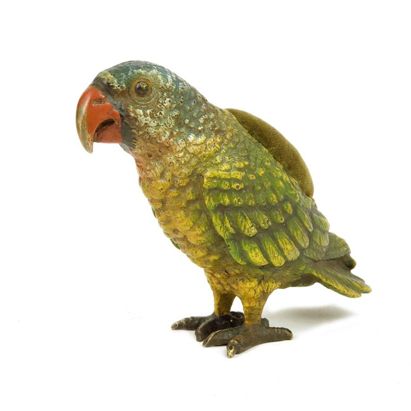 An Austrian cold painted bronze parrot pin cushion, stamped 'GESCHUTZT' and with Bergman stamp 'B in a vase', numbered '2837', early 20th century, 9.1cm high, 10.5cm long.