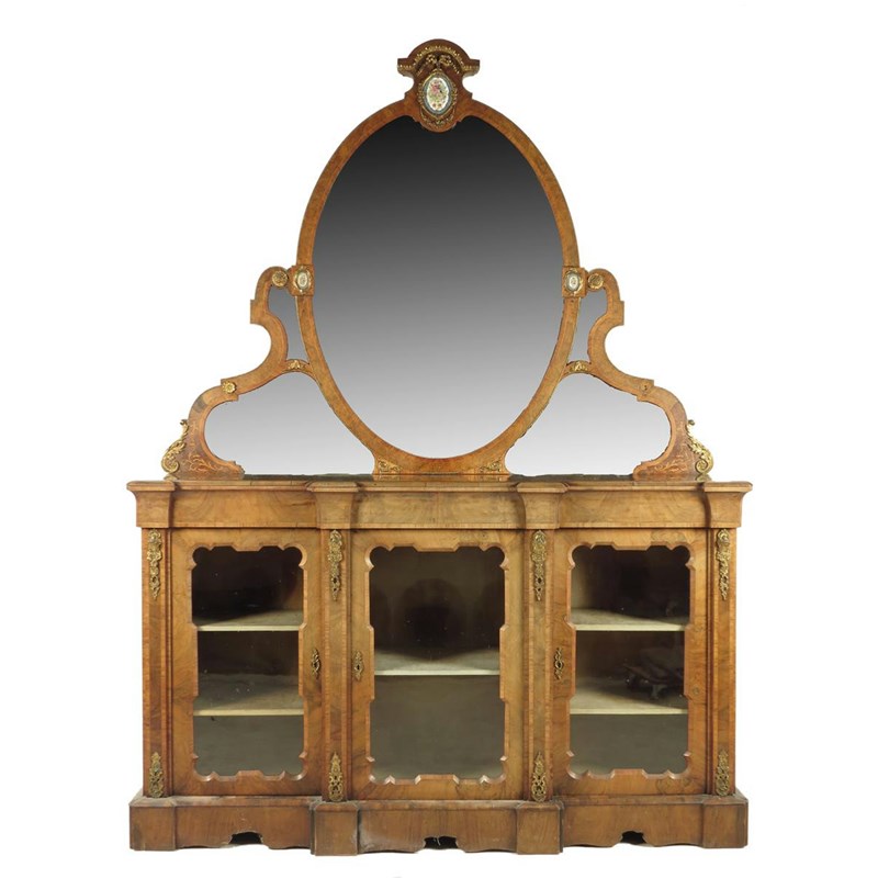 A Victorian walnut breakfront credenza, the associated mirrored back with Sevres style porcelain plaques and gilt metal mounts above three doors enclosing shelves, 248.7cm high,182.8cm wide, 45.5cm deep.