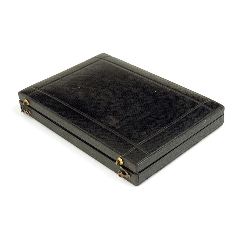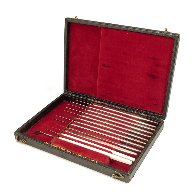 A set of Victorian ophthalmic instruments, in a leather case, stamped 'JOHN WEISS & SON, 287, OXFORD ST. LONDON', 16.2cm wide, 11.2cm deep.