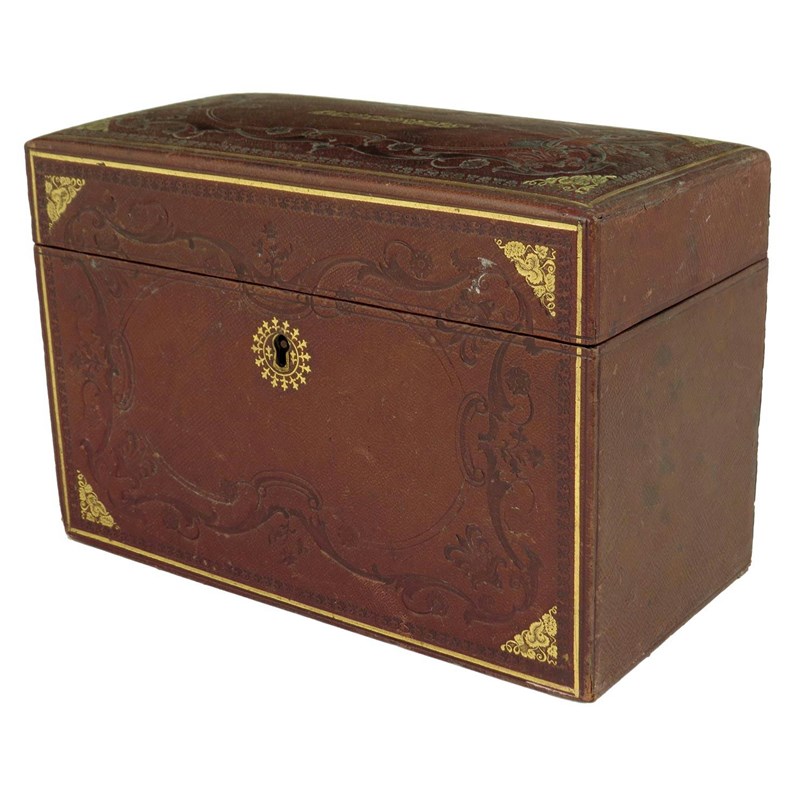 A late Victorian gilt tooled red leather stationery box, the hinged lid with a silk lining to a divided paper lined interior, 14.7cm high, 21cm wide, 11cm deep.
