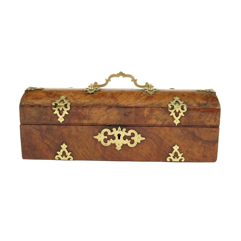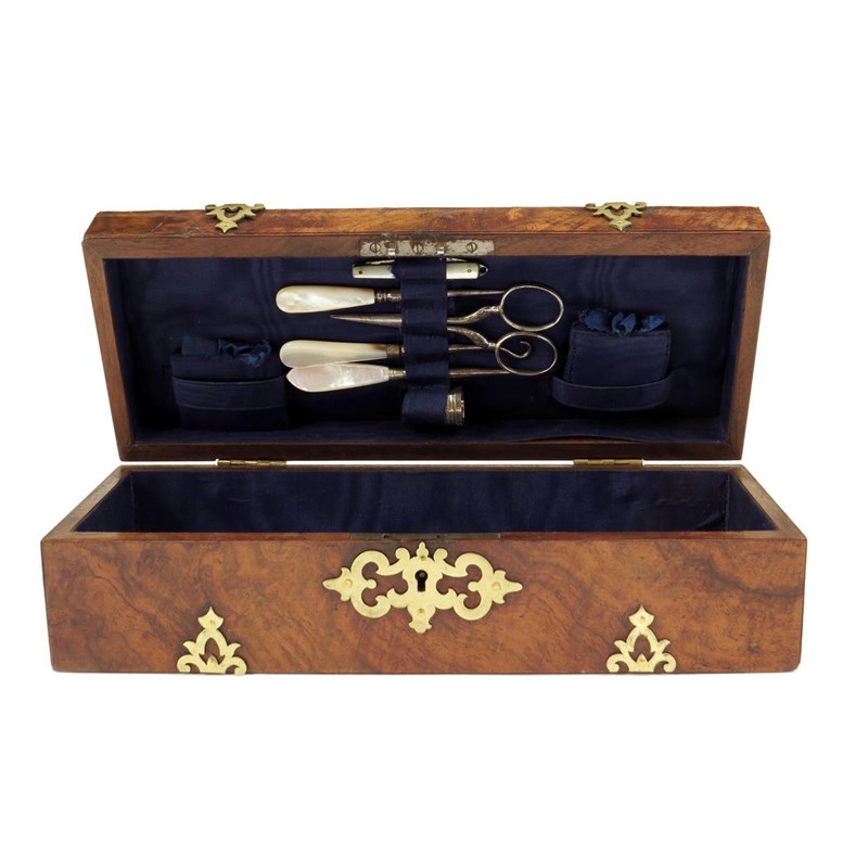 A Victorian walnut and brass mounted work / glove box, the hinged lid with a brass handle to a silk lined interior, the lid fitted with mother of pearl handled sewing utensils: a thimble, a needle case and a pin cushion, 8.5cm high, 25.7cm wide, 10.2cm deep.