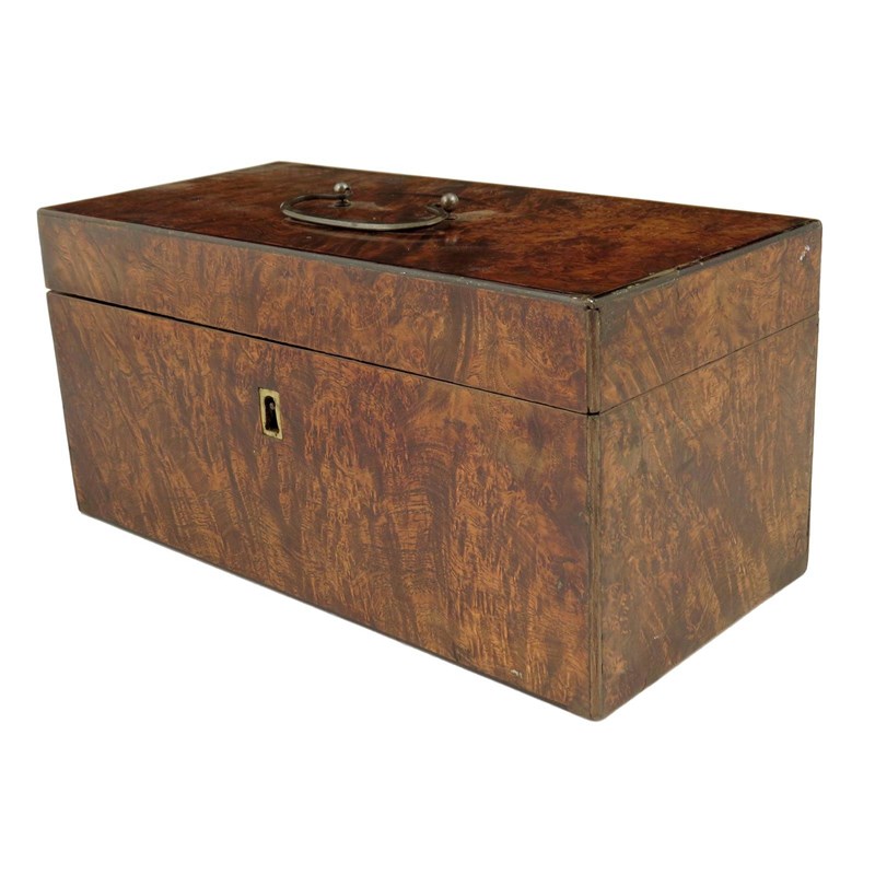 λ An early 19th century French burr elm tea caddy, with ebonised edging, the hinged lid with a faceted steel handle, the interior with a pair of lidded compartments with ivory handles, flanking a glass sugar bowl, 13.8cm high, 28.7cm wide, 14cm deep.