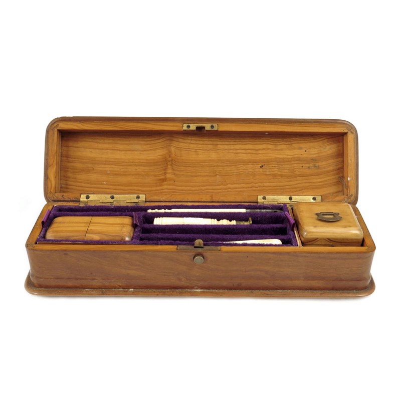 A late 19th century Italian olivewood writing box, with a brass handle, the divided interior with a lift-out tray, an inkwell, bone handled pens and a seal, 8.8cm high, 26.5cm wide, 8.2cm deep.
