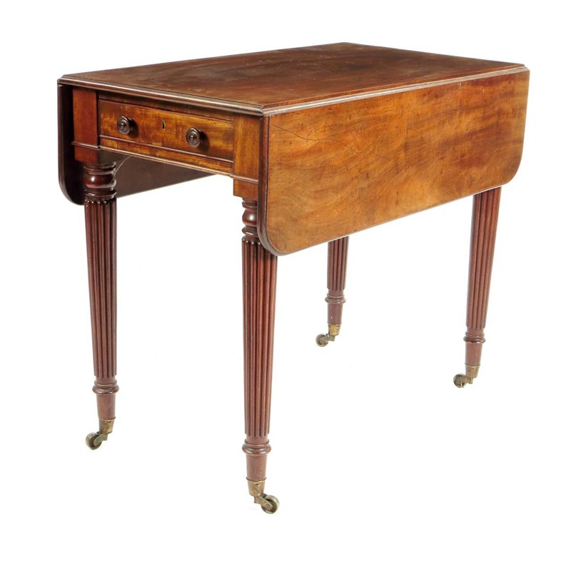 A William IV mahogany Pembroke table in the manner of Gillows, with a frieze drawer and a faux front to the reverse on ribbed tapering legs and brass caps and castors, 72.2cm high, 49cm wide (closed), 85cm deep.