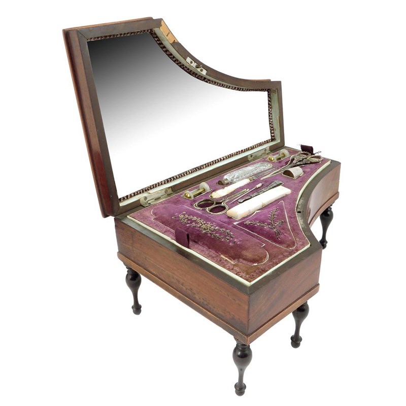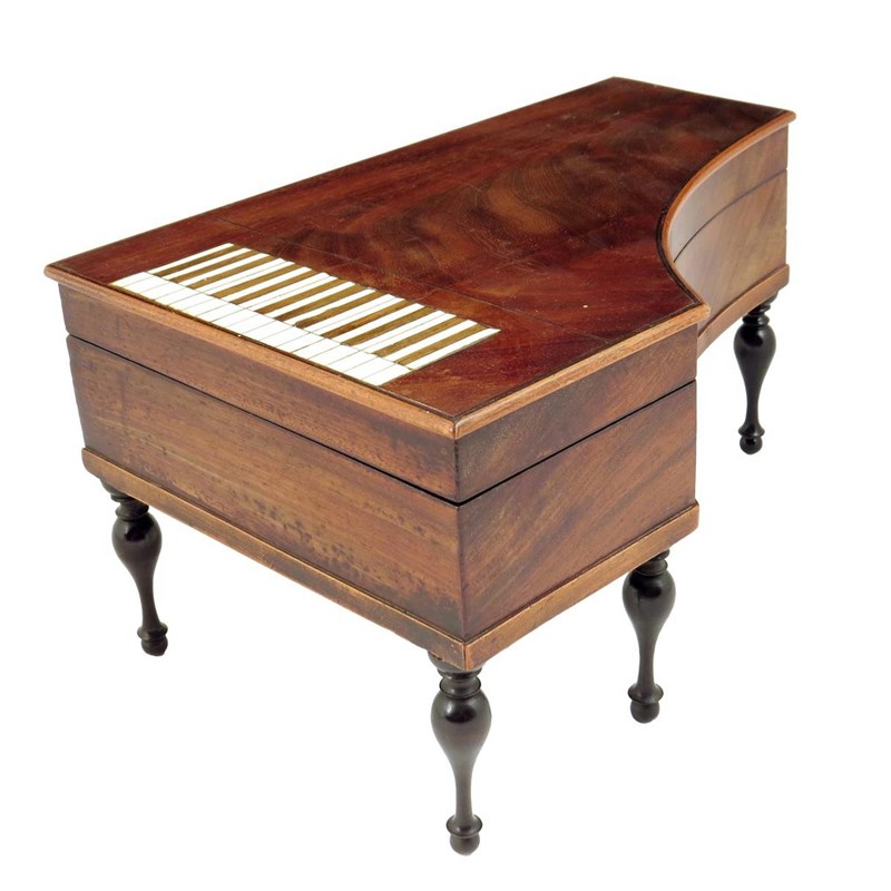 λ A 19th century French mahogany Palais Royale style piano étui, inlaid ivory and ebonised keys, the interior with a mirror to the lid and fitted with a lift-out plush lined tray with mother of pearl reel holders, bodkins and a case, with scissors, a scent bottle and a thimble, above a musical movement stamped '1575', on ebonised turned legs, 15.4cm high, 29cm wide, 19.1cm deep.