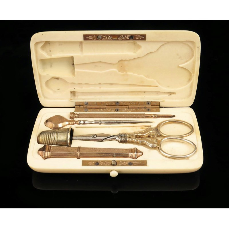 λ A mid 19th century French ivory etui, fitted with gilt metal and steel utensils: scissors, bodkin, thimble and a needle case, with a button handle, 11cm wide, 6.3cm deep.