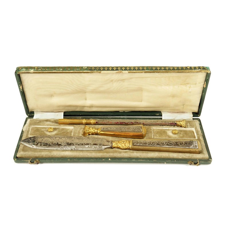 A Victorian gilt tooled green leather cased desk set, the silk and velvet lined interior with engraved steel and gilt metal mounted pen, seal and paper knife, the base inscribed in ink 'Augusta', 21cm wide, 7cm deep.
