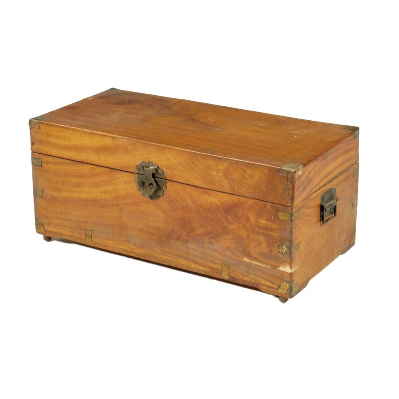 A Chinese camphor wood trunk, with an engraved brass clasp with iron side carrying handles on ball castors, early 20th century, 36cm high, 79.7cm wide, 37cm deep.