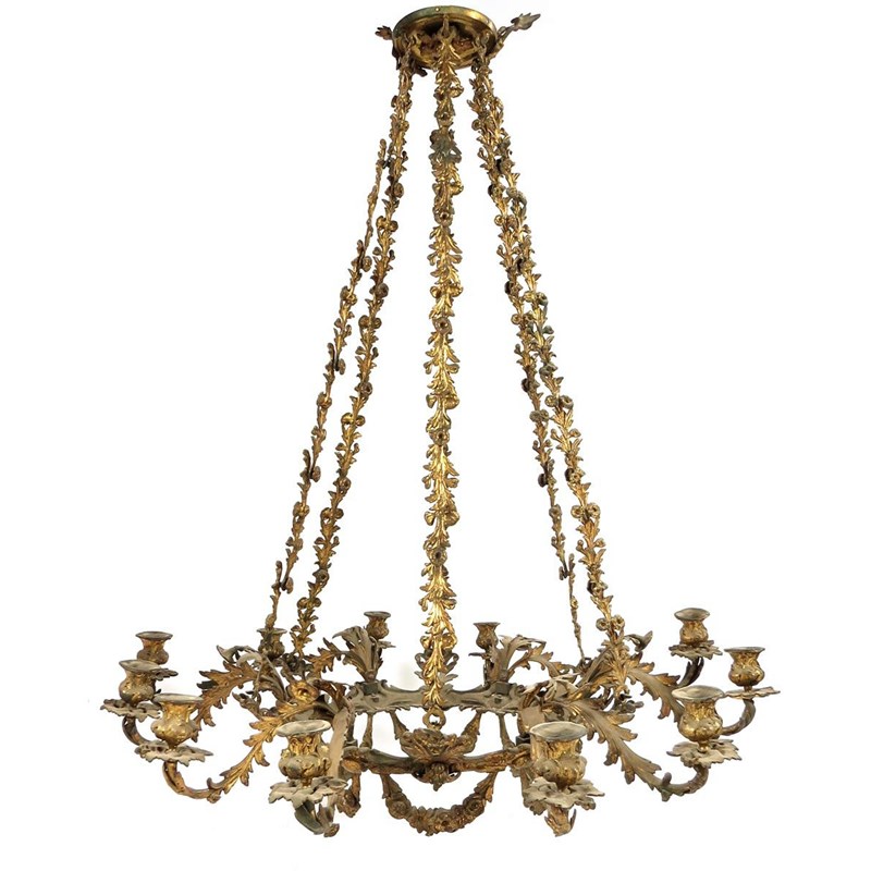 A 19th century gilt bronze ten light chandelier, of open form with leaf scroll branches and naturalistic sconces and hung with floral swags, 110cm high (approx), 90cm wide.
