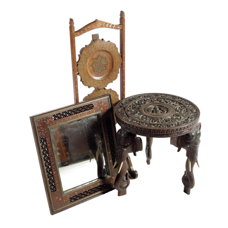 An Indian carved occasional table, on elephant's head legs, 39.3cm high, 38cm wide, an Indian hardwood and brass inlaid folding cake stand, with paper labels inscribed 'MADE IN BRITISH INDIA' and a brass inlaid mirror. (3)