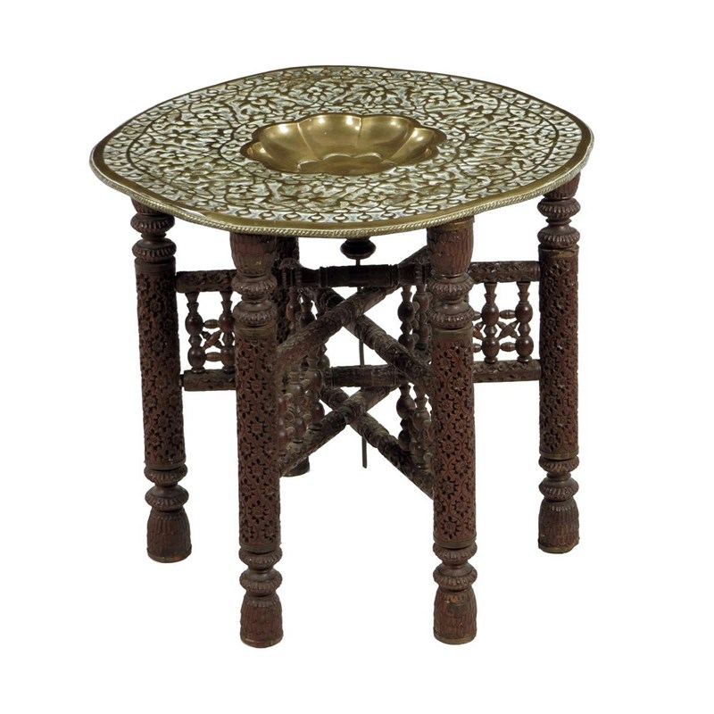 An Indian brass and carved hardwood folding occasional table, the top decorated with scrolling foliage centre with a scalloped well, the underside inscribed 'SCHOOL OF ART JEYPORE', early 20th century, 46.7cm high, 52.3cm diameter.