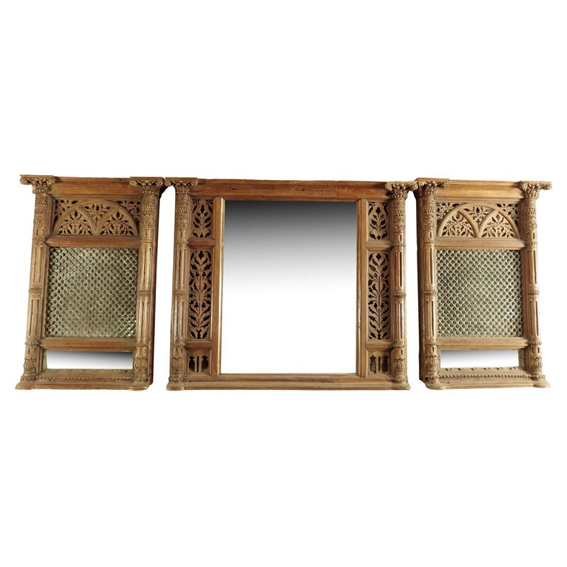 An Indian hardwood three section mirror, the rectangular plate flanked by fret carved panels and carved columns, with two conforming outer mirrors, 92.4cm high, 240.3cm wide. (3)