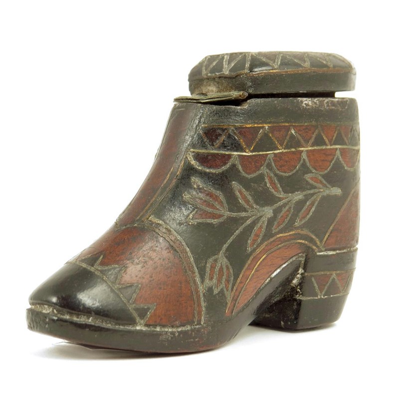 A 19th century treen and brass inlaid snuff shoe