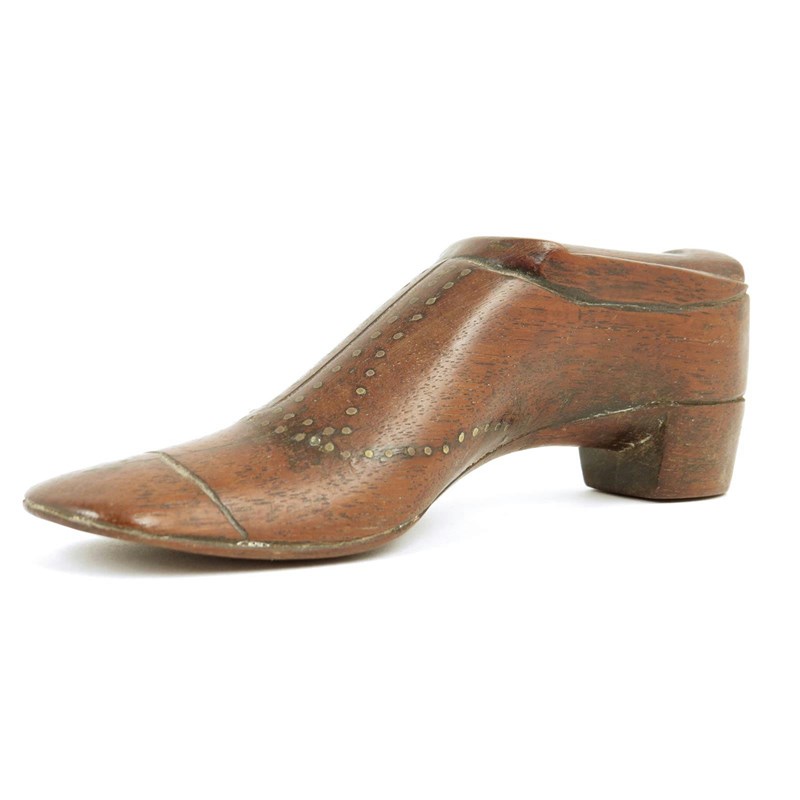 A 19th century treen snuff shoe, with a sliding cover and brass tack inlay, 4cm high, 14cm long.